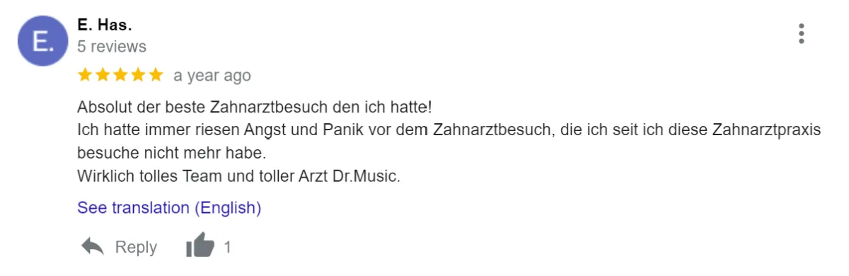 Absolut der beste Zahnarztbesuch den ich hatte! Ich hatte immer riesen Angst und Panik vor dem Zahnarztbesuch, die ich seit ich diese Zahnarztpraxis besuche nicht mehr habe. Wirklich tolles Team und toller Arzt Dr.Music.