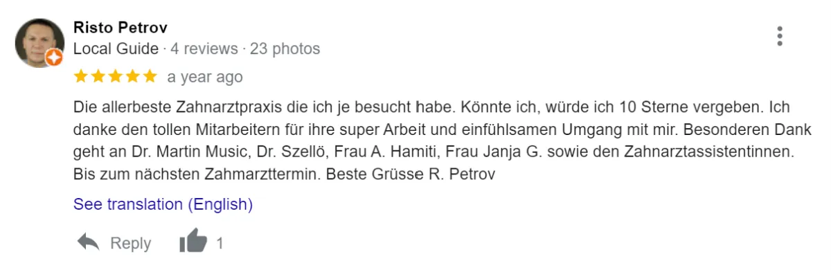 Die allerbeste Zahnarztpraxis die ich je besucht habe. Könnte ich, würde ich 10 Sterne vergeben. Ich danke den tollen Mitarbeitern für ihre super Arbeit und einfühlsamen Umgang mit mir. Besonderen Dank geht an Dr. Martin Music, Dr. Szellö, Frau A. Hamiti, Frau Janja G. sowie den Zahnarztassistentinnen. Bis zum nächsten Zahmarzttermin. Beste Grüsse R. Petrov