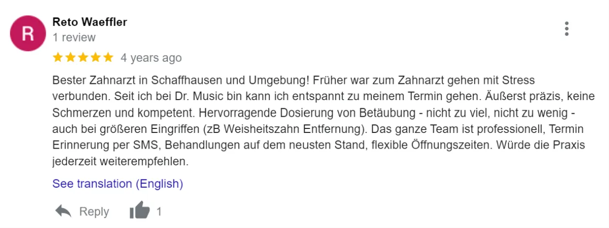 Bester Zahnarzt in Schaffhausen und Umgebung! Früher war zum Zahnarzt gehen mit Stress verbunden. Seit ich bei Dr. Music bin kann ich entspannt zu meinem Termin gehen. Äußerst präzis, keine Schmerzen und kompetent. Hervorragende Dosierung von Betäubung - nicht zu viel, nicht zu wenig - auch bei größeren Eingriffen (zB Weisheitszahn Entfernung).